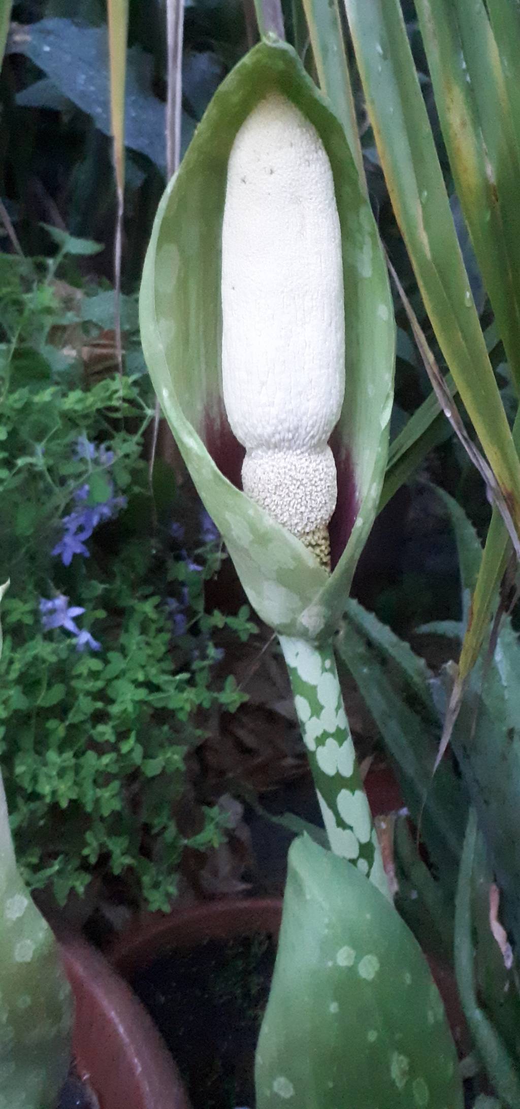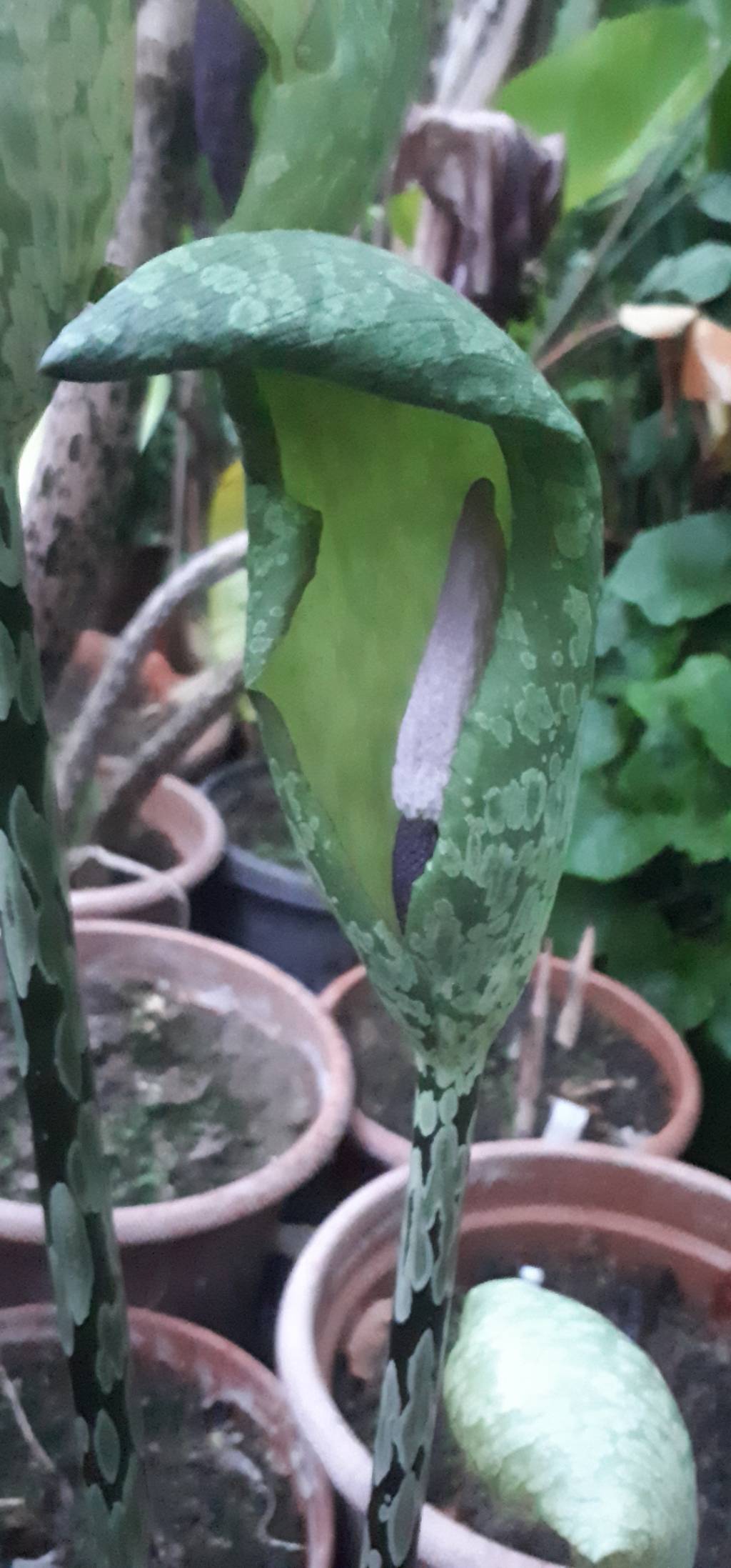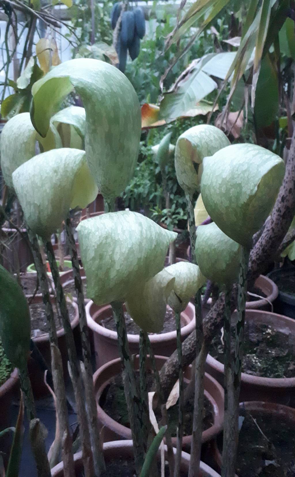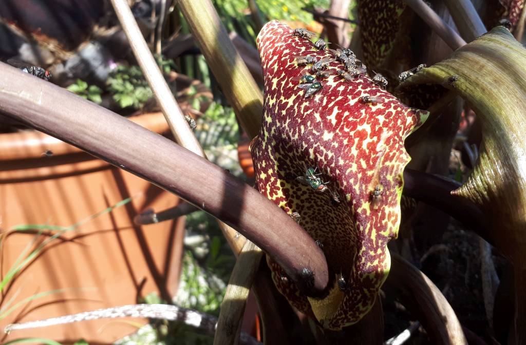 Alle Amorphophallus besitzen eine Knolle als Überdauerungsorgan. Aus dieser treibt nach der Ruhephase bei älteren Knollen zuerst die Blüte. Diese besteht, wie bei allen Aronstäben, aus einen Blütenstiehl auf dem ein Kolben steht. Der Kolben ist von einem Hüllblatt umgeben. Zum Anlocken der Bestäuberinsekten (hier Fliegen) duften die Blüten einige Tage in den Richtungen „tote Ratte“ oder „süßliche Müllkippe“…. Aber nach wenigen Tagen sind die Blüten bestäubt und der Duft verfliegt… zum Glück!