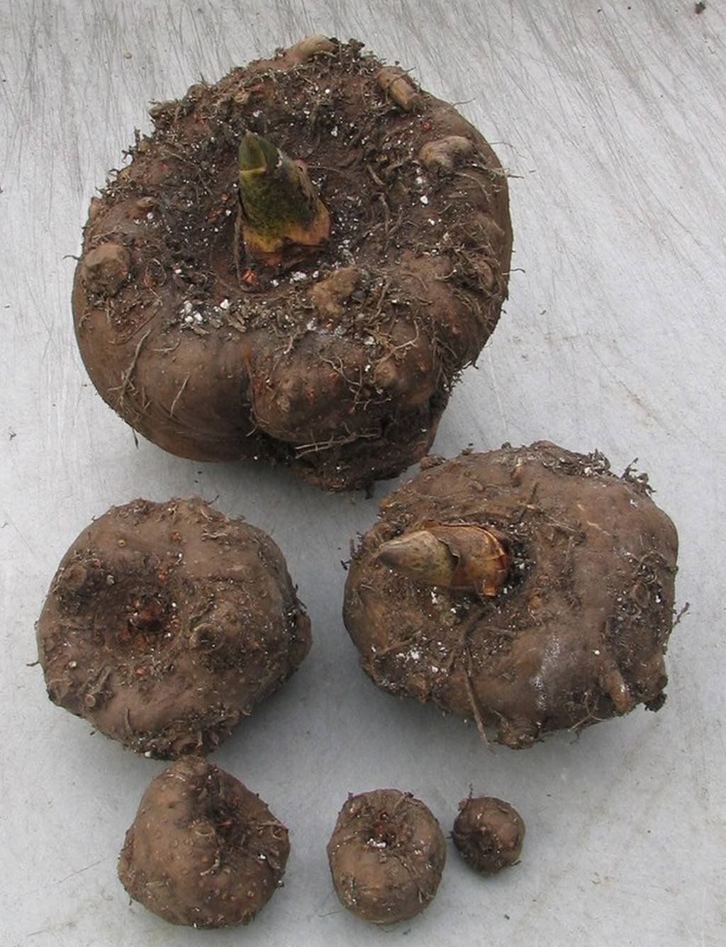 Im Herbst werden die Blätter gelb und knicken um. In dieser Zeit werden die Nährstoffe des Blattes in der Knolle eingelagert. Die Blätter auf den Töpfen liegen lassen, bis sie komplett vertrocknet sind, dann kann man sie einfach entfernen. Die Knollen dann im Topf mit der trockenen Erde zwischen 5 und 15°C dunkel lagern.