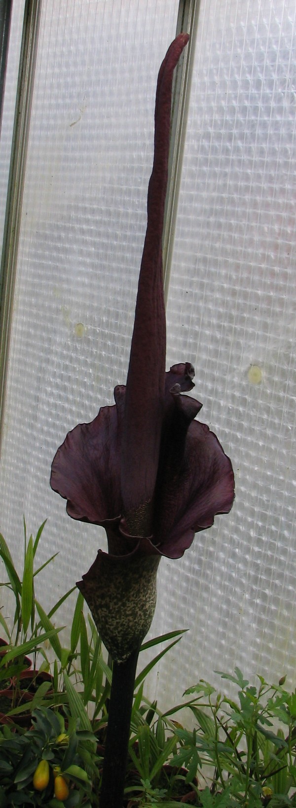 Amorphophallus ist eine Gattung der Aronstabgewächse. Am bekanntesten dürfte Amorphophallus titanum sein. Wenn diese tropische Art in botanischen Gärten blüht steht es in den Zeitungen! Ihr gigantischer Blütenstand ist der Größte im Pflanzenreich!