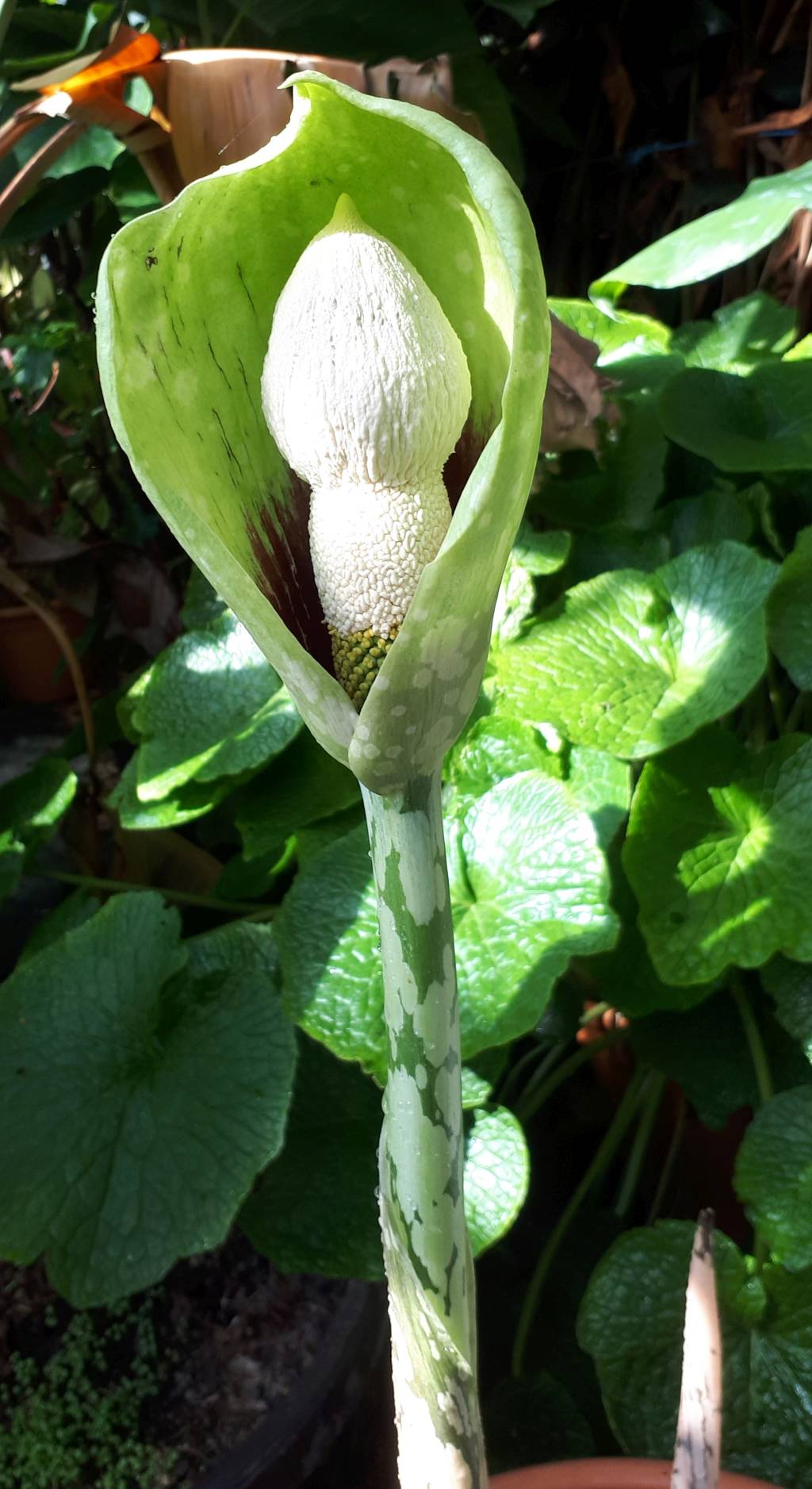 Einige Wochen nach dem Abblühen treibt aus der Knolle das Blatt. Je nach Art zwischen 50 cm und 2m hoch und auch so breit. Das Ganze hat dann was von einer Palme!